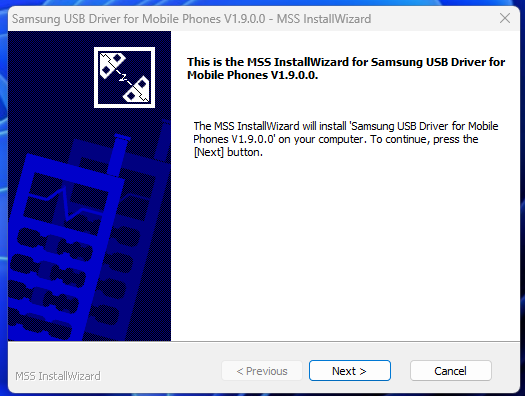 The Samsung USB Driver setup wizard will open. Click Next to begin the installation process.